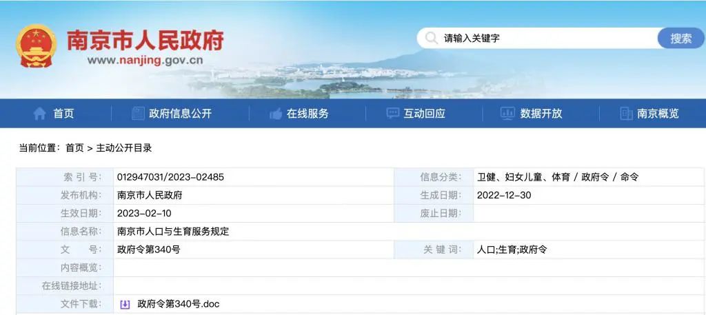 2022 年年底,南京市人民政府發布了第 340 號令,文件中明確《南京市人口與生育服務規定》已經 2022 年12月2日市政府第 154 次常務會議審議通過,自2023年2月10日起施行。